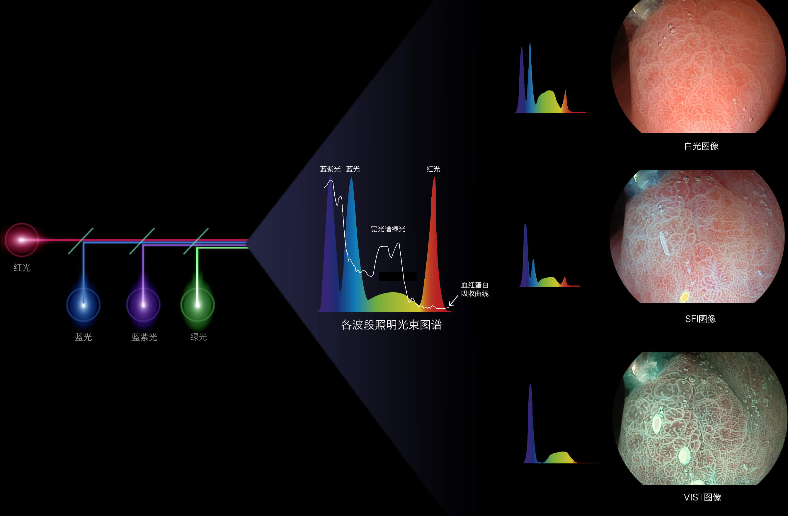 16877太阳集团新开发的内镜染色技术,主要是基于多波长LED 光源的开发,VLS-55Q 四波长LED 光源是由四个不同颜色的LED光按照相应照明模式所规定的特定发光比例进行合束后形成,合束后形成的照明光的光谱由红光、绿光、蓝光及蓝紫光这四个不同的波段范围构成。具有更高光谱自由度,通过光谱比例的控制,实现了聚谱成像技术,英文全称为“Spectral Focused Imaging, SFI”,缩写为“SFI”和光电复合染色成像技术,英文全称为“Versatile Intelligent Staining Technology, VIST”,缩写为“VIST”。